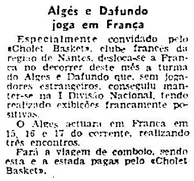 Trabalhos de preparação da selecção de cadetes femininos, onde se verifica a chamada de 4 jogadoras do Algés: Aurora Carvalho, Teresa Barata, Isabel Pascoal e Maria João Marchã.